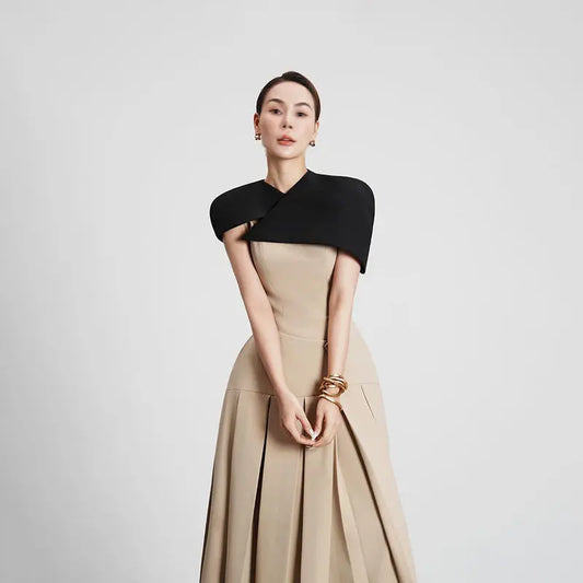 French Elegance Royal Style Long Dress Shoulder Cape Sleeveless Design Waist-Cinching Irregular Hem Women's Dress