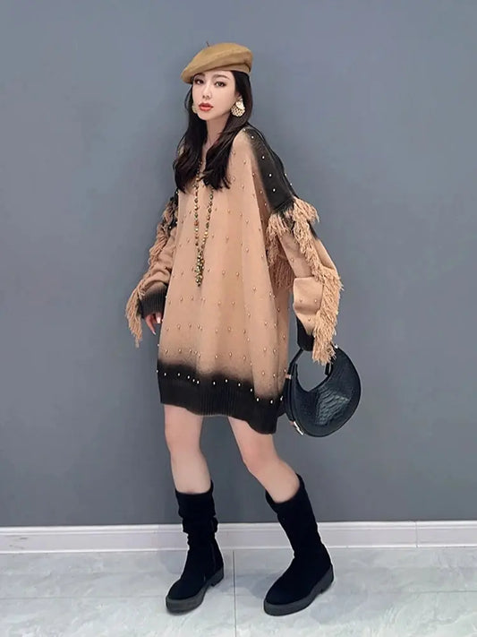CHICEVER Patchwork Tassels Sweaters For Women Round Neck Long Sleeve Spliced Embroidered Flares Hit Color Knit Sweater Female