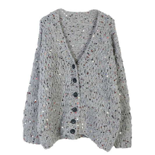 Glitter sweater cardigan women's gray long sleeved sweater lazy style loose French fashion V-neck single breasted sweater