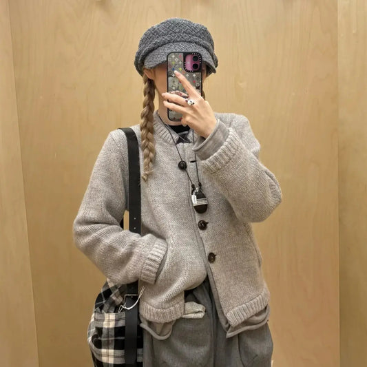 Autumn/Winter New Vintage Mock Two-Piece Ribbed Knit Sweater Cardigan Women's Long Sleeve Coat Top Gray